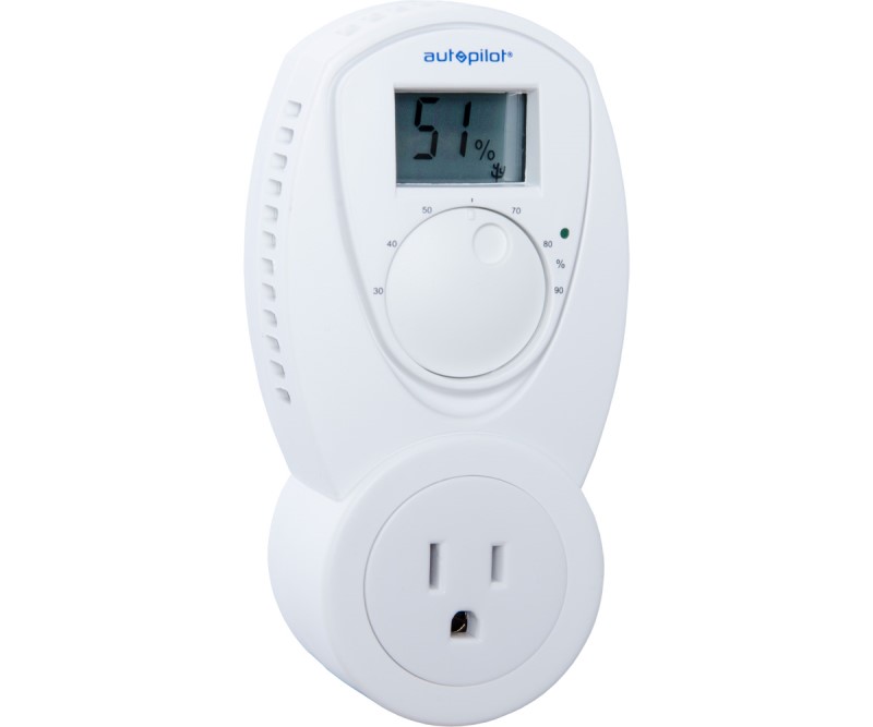 The Autopilot Dehumidifying Humidistat is a compact and easy-to-use controller for dehumidifiers and exhaust fans. Simply plug it into a power receptacle and then plug your dehumidifying device into its outlet, then choose your preferred relative humidity (RH) setpoint with the rotary knob. When its built-in sensor senses that the RH has exceeded the setpoint by at least 1%, it will automatically activate your dehumidifying device by powering the outlet. Its green LED light illuminates when the outlet is activated to on. When the RH in the room has dropped at least 1%, the Autopilot Dehumidifying Humidistat will cut power to the dehumidifying device. Digital screen displays current in room relative humidity. It has a built-in 1% RH deadband and is ETL-listed. Max power handling 15A.