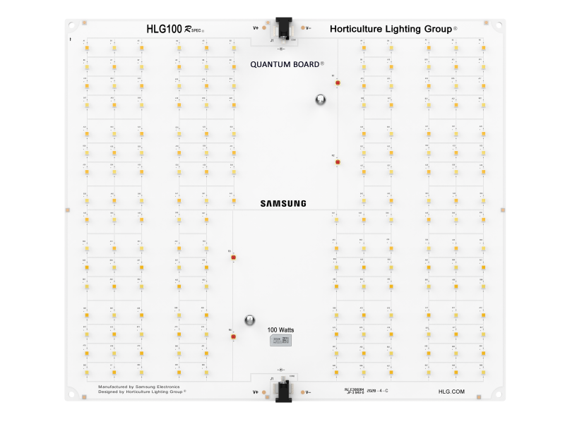 HLG 100 Rspec® uses high efficiency white light Quantum Boards® made by Samsung using the latest LM301H full spectrum and LM351H Deep Red LED's to help with flowering. This fixture produces 220 PPF, 14,000+ Lumens with just 95 Watts of power. Equivalent to 220W T5 or 300W CFL output or 200W metal halide.